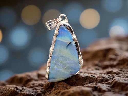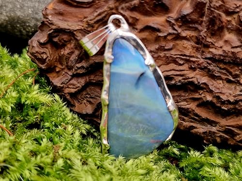 LeoLars-PABE Boulder Opal Design Anhänger aus 925ere Silber, Spezialfassung individuell, Opal mit gemeiner Opalschicht und partiellem Opalfeuer in grün und blau, Unikat, Handarbeit, Unisex