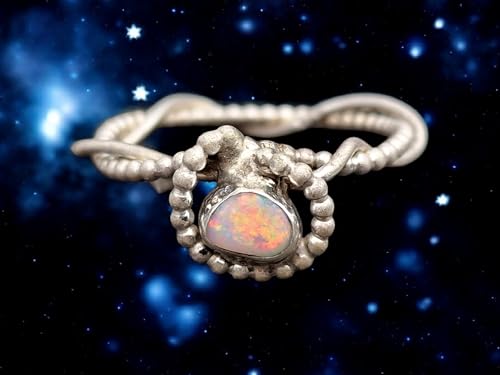 LeoLars-PABE Heller Lightning Ridge Opal Design Ring mit viel rotem Opalfeuer und Multicolor, Gr. 58 (18,5), aus 925er Silber, verspielt, mit Perldraht, Unikat, Handarbeit