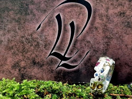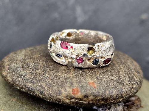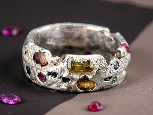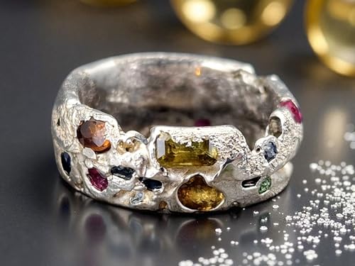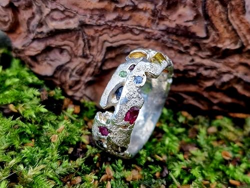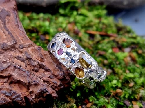 LeoLars-PABE Sandguss Chaos Design Ring, Gr.55 (17,5), aus 925er Silber mit echten eingegossenen Edelsteinen, Sandguss typische Oberflächen Struktur, Nr. 157, Unikat, Handarbeit