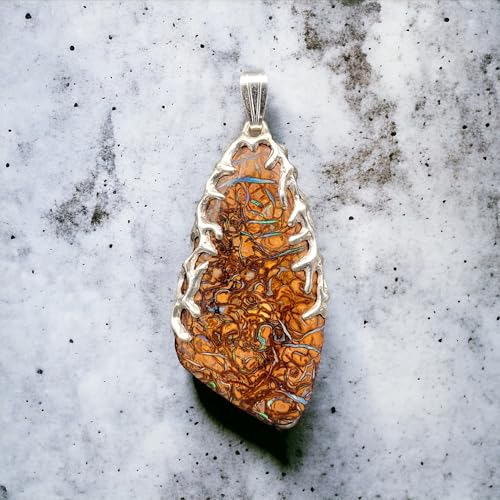 LeoLars-PABE Tribal Design Boulder Opal Anhänger aus 925er Silber mit herrlichem Muster und partiellem Opalfeuer, beidseitig Tragbar, Unikat, Handarbeit