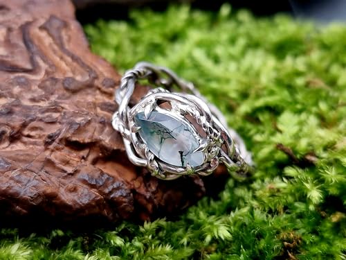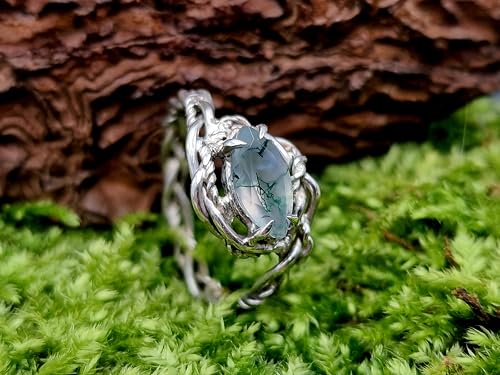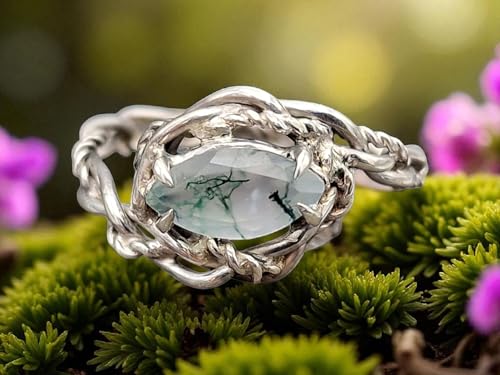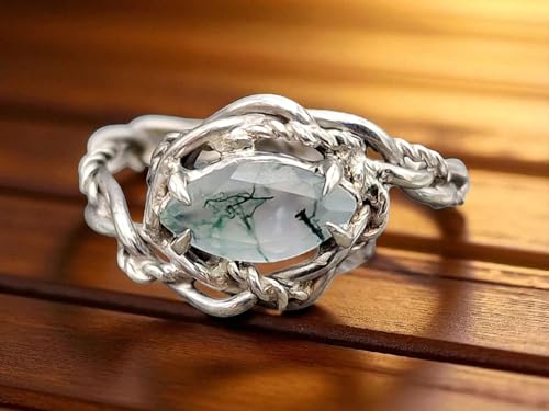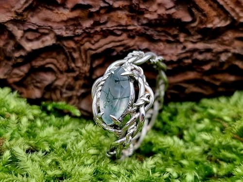 LeoLars-PABE Verspielter Moosachat Design Ring aus 925er Silber, Gr. 57 (18,3),Moosachat mit schönem Innenleben als Navette facettiert, Nr.0103, Unikat, Handarbeit