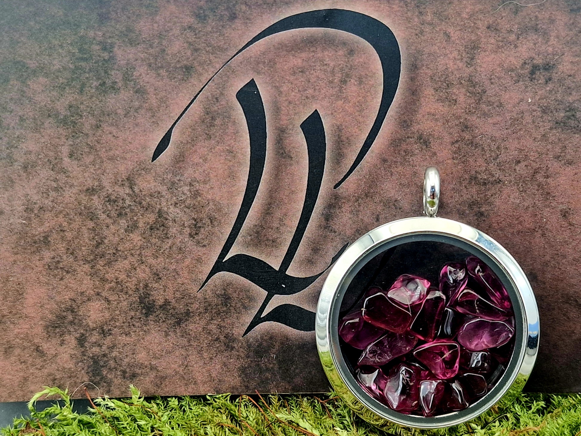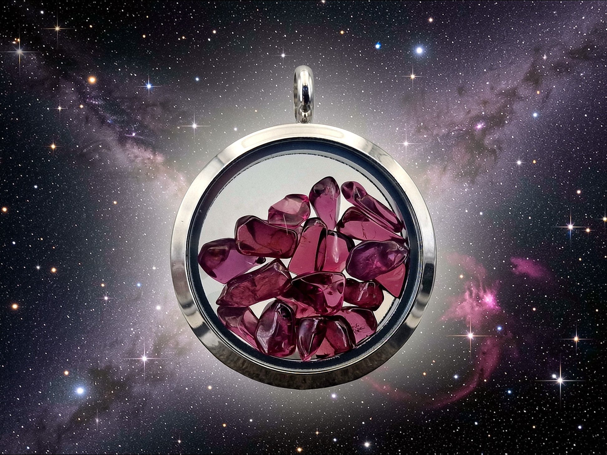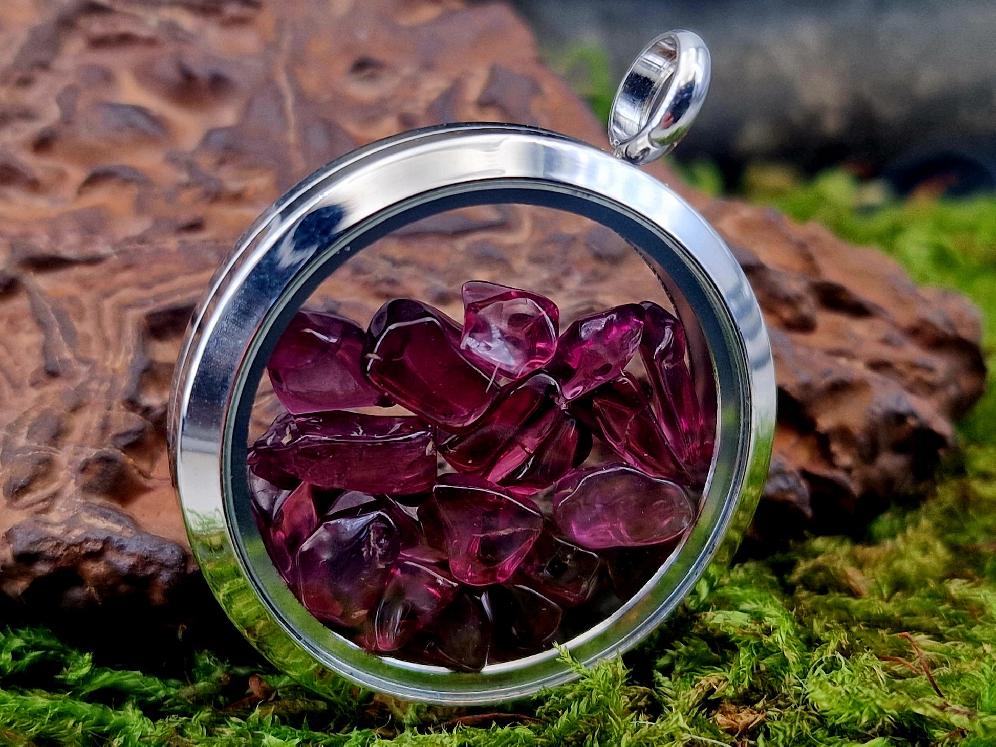 Silberfarbener Edelstahl/Glas Anhänger, gefüllt mit getrommeltem Granat, Nr.128, beidseitig tragbar, von Hand individualisiert, Kette im Lieferumfang enthalten, 3cm Durchmesser